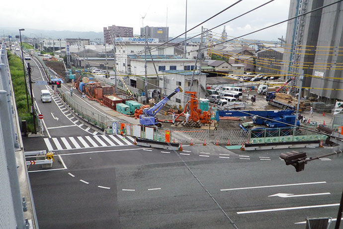 歩道橋の杭基礎写真です。この杭はTBH工法と言って、狭い場所や、上空に障害物(この現場の場合は電線)がある場合に有効な工法です。